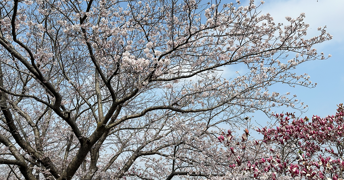 空を背景に咲く桜は、見上げるととても気持ちよく、この時期ならではの景色です。